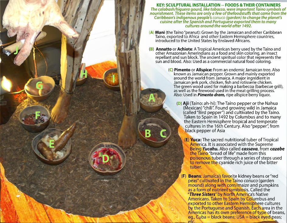 CLOSEUP OF the sculpture "MARACA-EL BOHIKE" (or "Bohique", a Taíno shaman. The wood, gourd and shell sculpture translates as "Bird Shaman", a reference to the ONE WHO DOES NOT BLINK or "The Bird-Watchman of the Cave of the Jagua" from the Taíno Creation Story): These are items from Columbus' Caribbean Encounter of 1492 that were taken to some of the world's other Tropical and Temperate Zones (Africa, Asia & Europe) by the Spanish and Portuguese. These items from the Tropical Americas became parts of Anansi stories in the Caribbean sometime during the 16th to 17th Centuries with the increased arrival of Africans, especially from West Africa.