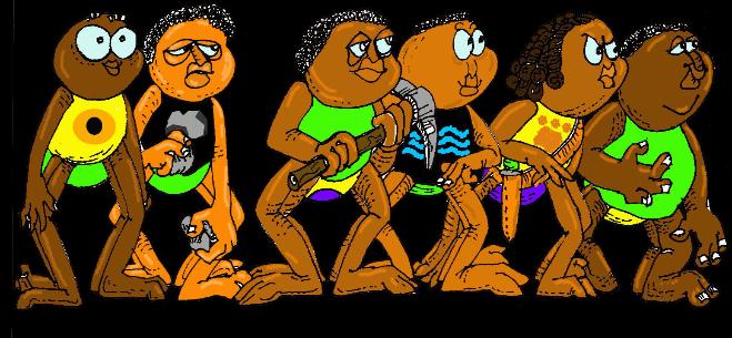 | Anansi's six other children have names that are associated with their abilities. L-R are Akaki, the one able to see trouble. Toto Abuo, the stone thrower. Twa Akwan, the road builder. Hwe Nsuo, the one able to dry up rivers. Adwafo, the skinner of game. Da Yi Ya, the one who could lie on the ground like a cushion |