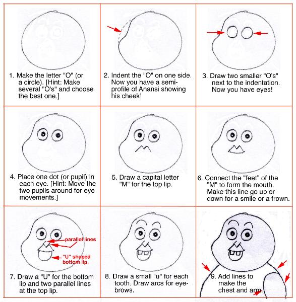| Print this and... DRAW ANANSI'S PORTRAIT IN 9 EASY STEPS (For all ages) [Materials: Paper, #2 pencil, black (fine or medium) marker, color markers (or crayons, or color pencils), and a mirror.] However, before drawing Anansi you may first need a WARM-UP EXERCISE. |